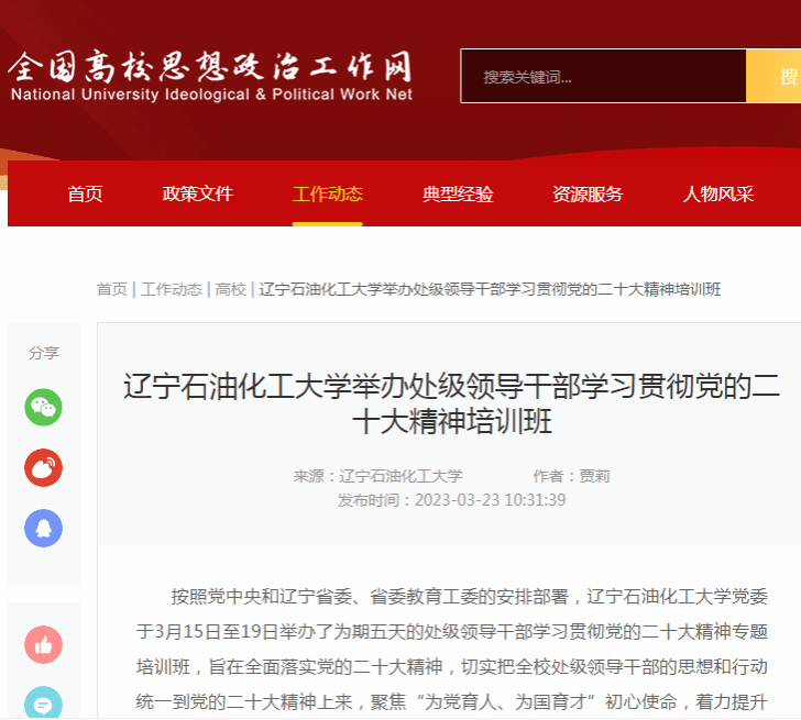 编者按:近日,全国高校思想政治工作网、辽宁日报·北国号对我校党委于3月15日至19日举办了为期五天的处级领导干部学习贯彻党的二十大精神专题培训班,旨在全面落实党的二十大精神,切实把全校处级领导干部的思想和行动统一到党的二十大精神上来,聚焦“为党育人、为国育才”初心使命,着力提升领导干部队伍素质能力,统一思想、提振信心,推动学校各项事业高质量发展进行了宣传报道。现将相关报道转载如下: