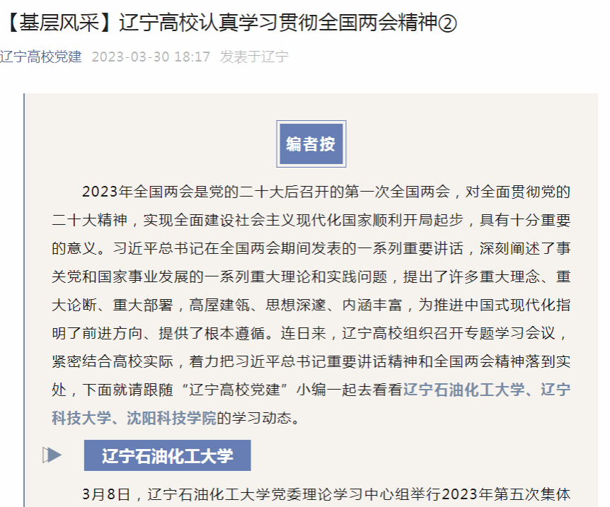 编者按:近日,辽宁高校党建微信公众号对辽宁高校组织召开专题学习会议,紧密结合高校实际,着力把习近平总书记重要讲话精神和全国两会精神落到实处进行了宣传报道,其中对我校党委理论学习中心组举行2023年第五次集体学习,专题学习习近平总书记在参加江苏代表团审议时的重要讲话精神,深入学习习近平总书记在看望参加政协会议的民建工商联界委员时的重要讲话精神进行了组稿。现将相关报道转载如下: