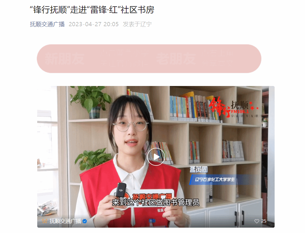 编者按:4月27日,抚顺经济交通广播微信公众号对我校石油天然气工程学院的同学们作为志愿者走进“雷锋·红”社区书房,向社区捐赠图书进行了宣传报道。现将相关报道转载如下: