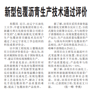 编者按:近日,中国化工报对我校新型包覆沥青生产技术通过评价,以“新型包覆沥青生产技术通过评价”为题进行了宣传报道。现将相关报道转载如下: