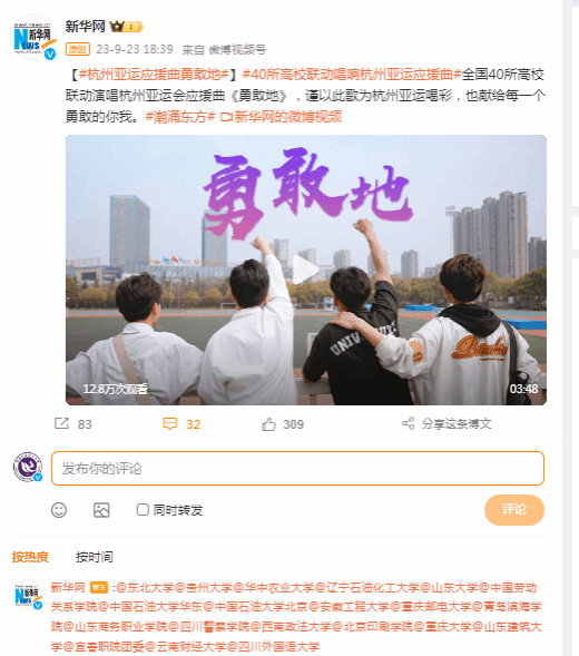 新华网:40所高校联动唱响杭州亚运应援曲《勇敢地》