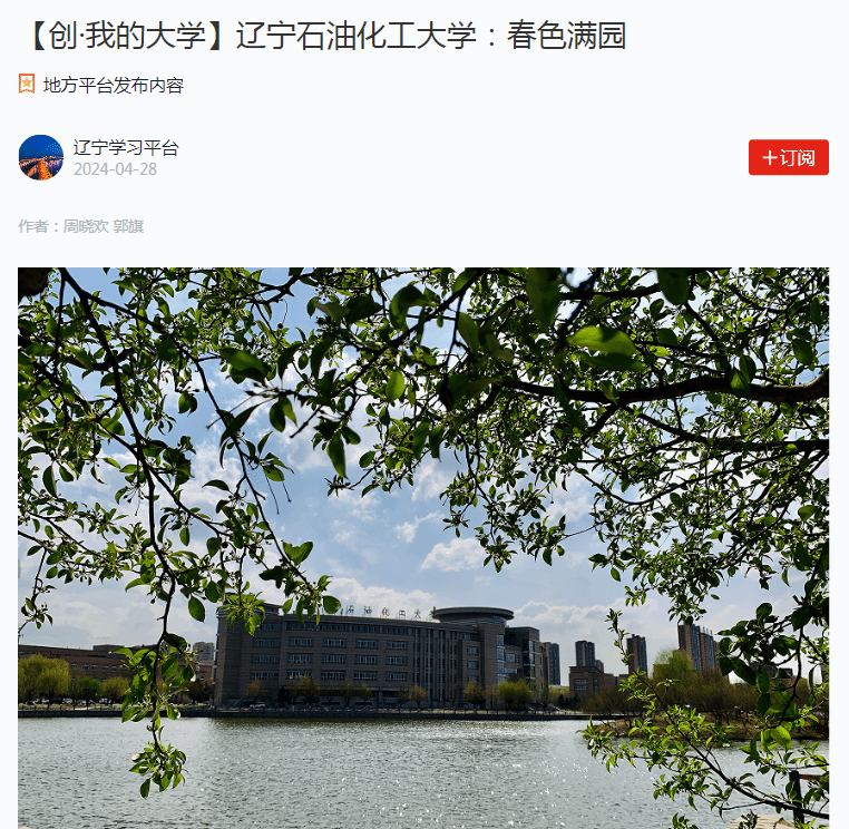 编者按:近日,学习强国辽宁学习平台对我校周晓欢老师、郭旗同学拍摄的学校春景图片进行了宣传报道。现将相关报道转载如下: