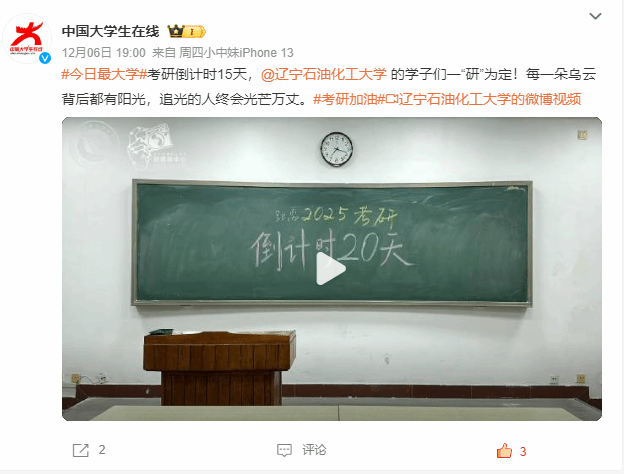 编者按:考研倒计时15天,学校新媒体中心制作视频祝福学子考研成功。教育部中国大学生在线官方微博对此进行了转发宣传。现将相关报道转载如下: