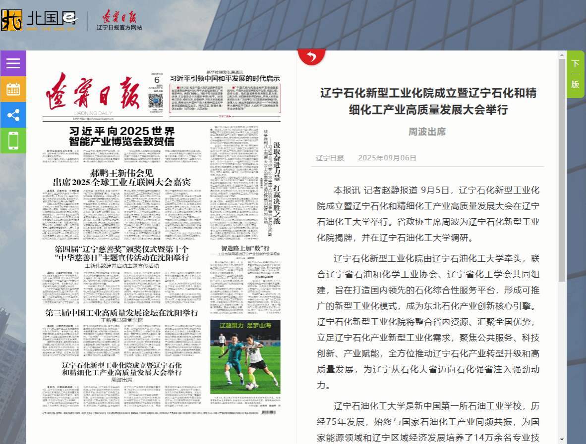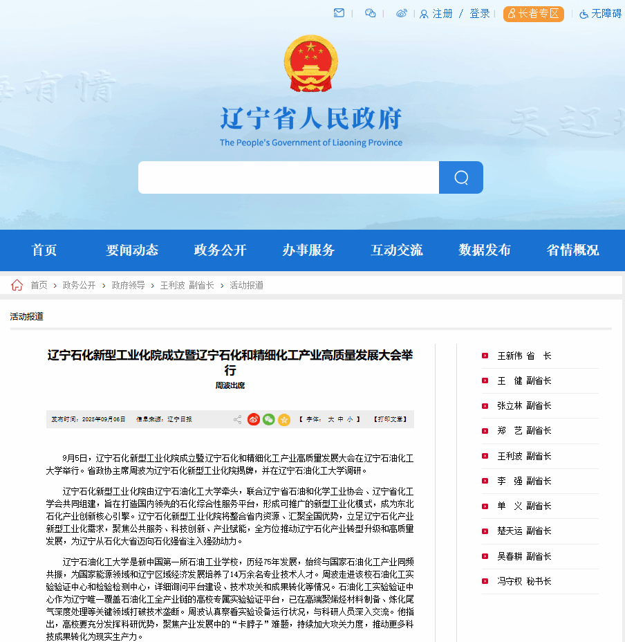编者按:9月5日,辽宁石化新型工业化院成立暨辽宁石化和精细化工产业高质量发展大会在我校举行。省政协主席周波为辽宁石化新型工业化院揭牌,并在我校调研。辽宁省人民政府网、辽宁省教育厅网站、辽宁卫视、辽宁日报、辽宁政协微信公众号、中国工业和信息化中央新闻网站、学习强国辽宁学习平台、北斗融媒、东北新闻网、北国网、新浪财经等50余家媒体平台对此进行了宣传报道。现将相关报道转载如下:
